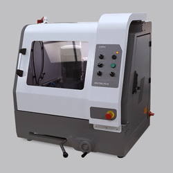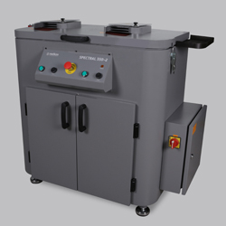 per la preparazione spettroscopica di campioni di acciaio e materiali ferrosi, monodisco o due dischi indipendenti da 350 mm di diametro, bilanciati dinamicamente, con motore da 2,2 kW, con velocità di rotazione di 2800 rpm o con doppia velocità 1400/2800 rpm, aspirazione a mezzo microfori inseriti sul piatto che permette inoltre l’ancoraggio della carta, fenditura sul disco per posizionamento del campione, sistema di raccolta esausti con filtro facilmente sostituibile, interruttore di sicurezza che blocca la macchina con coperchio aperto