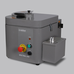 per la preparazione spettroscopica di campioni di acciai e materiali ferrosi, macchina robusta esente da vibrazioni, potente motore da 1,1 kW, disco di lavoro di 250 mm di diametro, con velocità di rotazione di 2800 giri / min, arresto rapido del piatto, aspirazione a mezzo microfori inseriti sul piatto che permette inoltre l’ancoraggio della carta, fenditura sul disco per posizionamento del campione, cassetta di contenimento polvere con presa standard per aspirazione.
