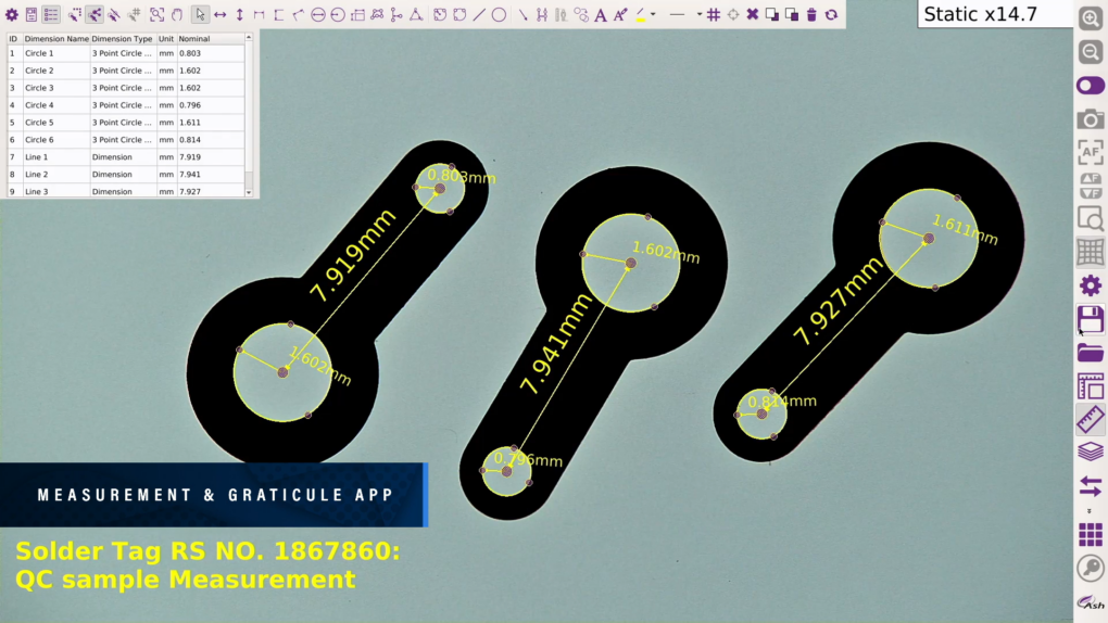 - MISURE 2D E ANNOTAZIONI Applicazione di misurazione 2D intuitiva. Punto a punto, diametro, angolo, griglia X-Y regolabile, annotazioni. La creazione di reticoli consente di analizzare i campioni in passa/non passa con limiti di tolleranza preimpostati.