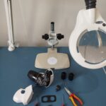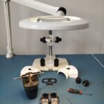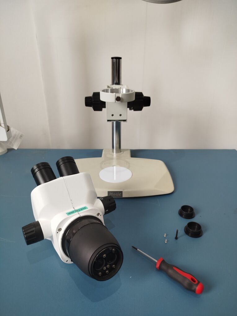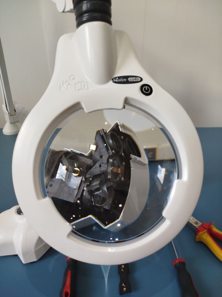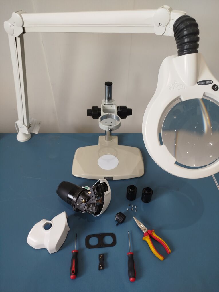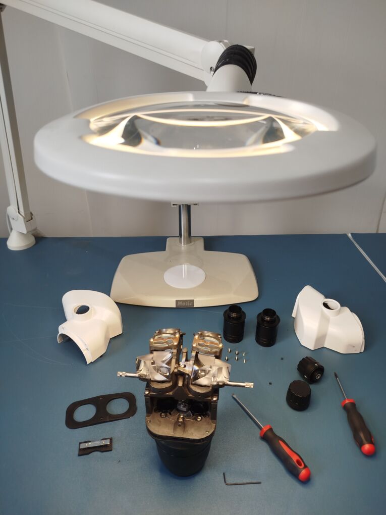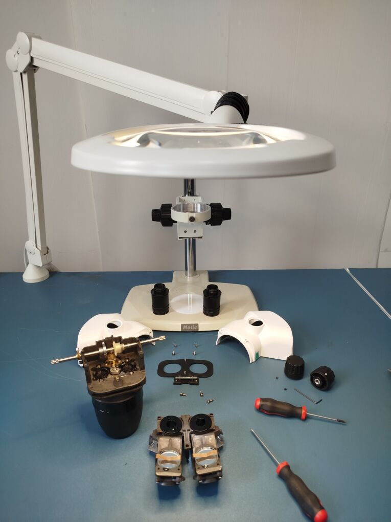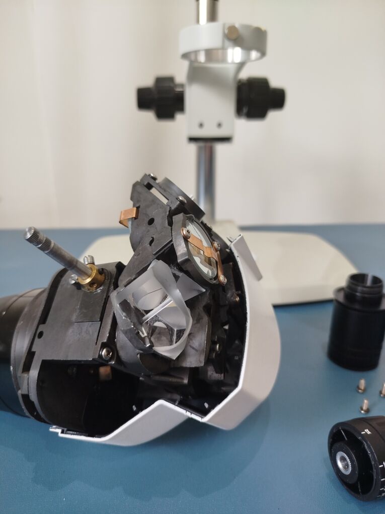 Di seguito alcune immagini relative alla manutenzione di un microscopio ottico Vision. L’intervento ha incluso la pulizia approfondita delle ottiche interne, la sostituzione degli specchi danneggiati e la regolazione del sistema di messa a fuoco micrometrico, per garantire fluidità e precisione nell’utilizzo quotidiano: