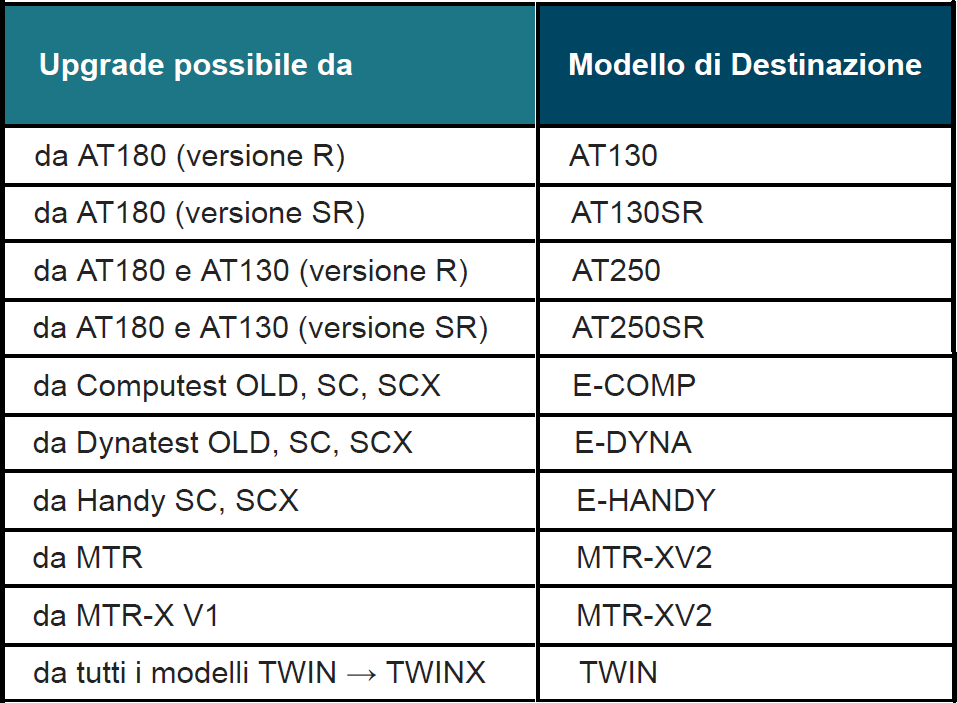 Consulta la tabella e scopri in un attimo se il tuo strumento può essere aggiornato con il nostro programma upgrade.